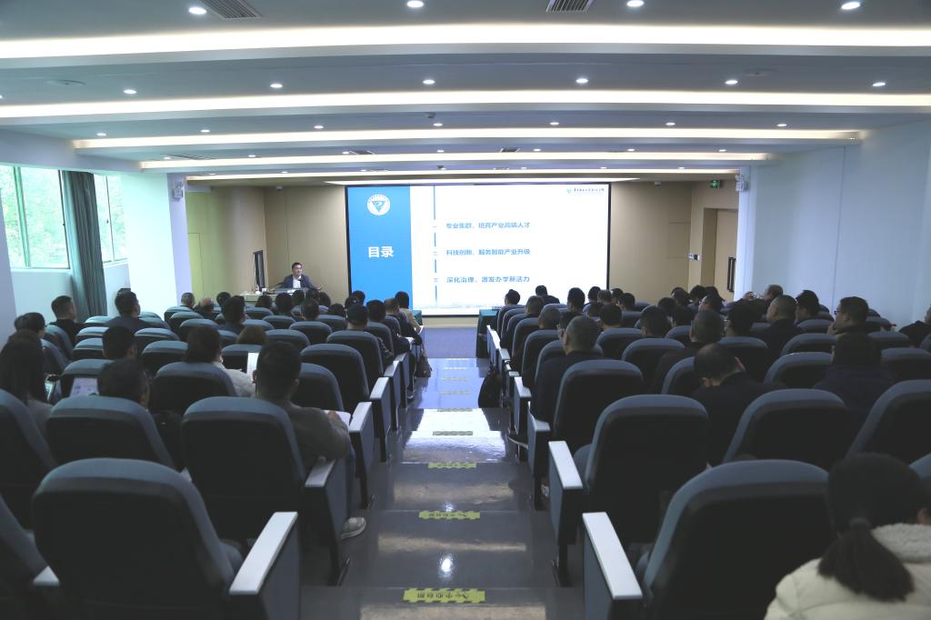 聂强教授以《“双高”校建设的实践与思考》为题,结合学校“双高计划”建设,聚焦三方面分享了“双高计划”建设经验和高等职业教育研究成果。一是围绕专业群组群逻辑的定义、专业群理论基础、专业群人才培养模式的改革、平台+模块化的课程体系、书证融通课程体系开发等方面,深入阐释了“双高计划”专业集群组建和产业高端人才培育的着力点;二是围绕科技创新、技术研发,全面分享了学校科学研究和成果转化助力区域产业升级的支撑点;三是借助学校内部治理结构改革、机制建设和绩效分配,细致讲述了学校十年深化内部治理、激发办学活力、支撑教育事业高质量发展的全过程。