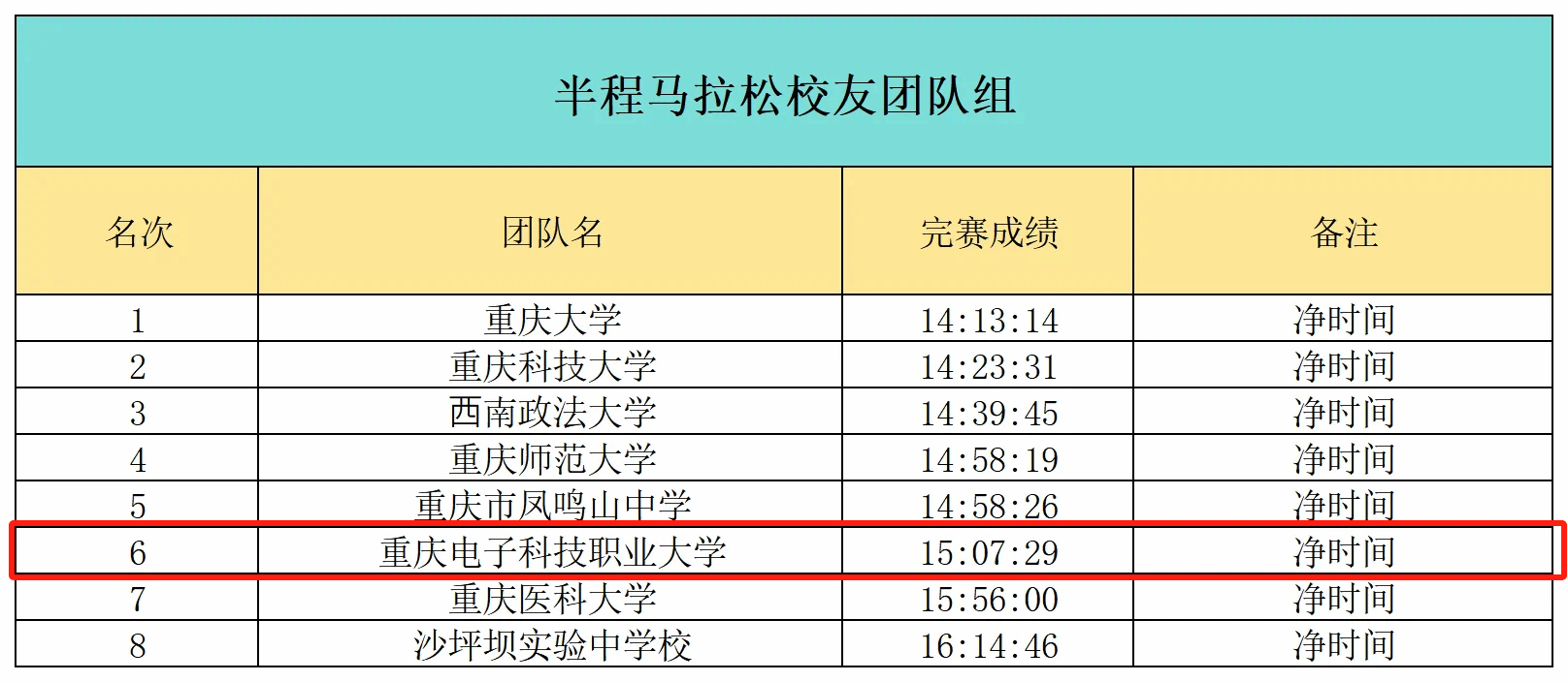 赛事圆满落幕,喜报传来:我校于首个主打“校友”品牌的城市半程马拉松赛事中,荣获男子个人季军和总成绩第6名的佳绩(取代表本校参赛的最好10人成绩,含男8人女2人),并凭借广泛的校友参与度和出色的组织工作,荣获“优秀组织奖”,重电人以强大的凝聚力和拼搏精神,令“龙马精神”闪耀赛道,完美诠释了从“崇尚体育、献身兵工”到“体教结合、完全人格”不断发扬光大的文化传承!