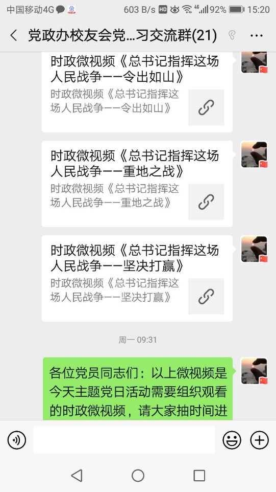 活动最后,王永中同志要求大家抽时间观看时政视频《总书记指挥这场人民战争—令出如山》、《总书记指挥这场人民战争—重地之战》、《总书记指挥这场人民战争—坚决打赢》,并做好研讨准备。