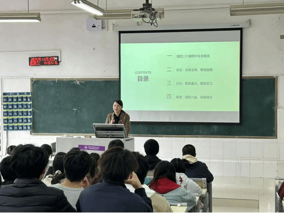 2025年11月12日下午,学习贯彻党的二十届四中全会精神专题党课在我校博德楼B209教室举行。党委常委、党政办公室主任金琳同志为支部党员和同学们带来了一堂深刻而富有感召力的专题党课,深入解读全会精神,共同展望国家发展宏伟蓝图。